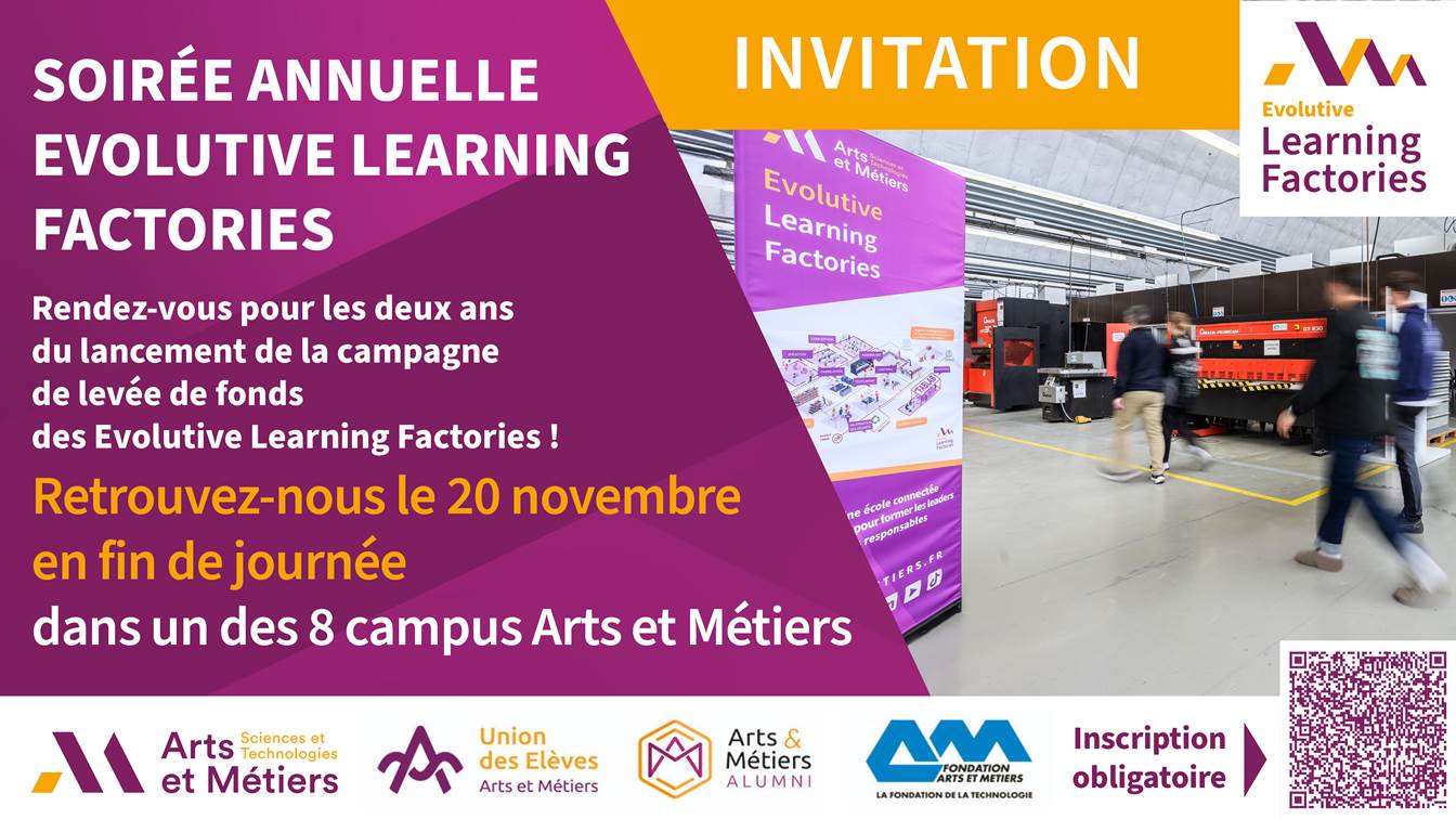 Arts et Métiers vous donne rendez-vous le jeudi 20 novembre 2025 de 17:00 à 20:00 pour les deux ans du lancement de la campagne de levée de fonds des Evolutive Learning Factories !
